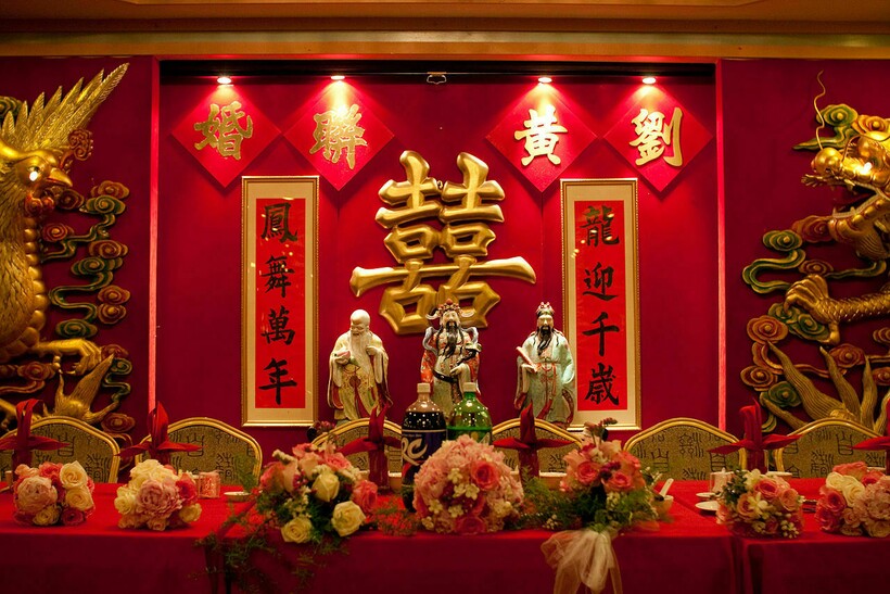 Перед началом банкета молодожёнам подают бокал вина. Они пьют половину напитка, держа бокал в одной руке, затем меняют руку и допивают вино. Китайцы верят, что этот обряд поможет молодожёнам любить друг друга крепко на протяжении всей жизни.