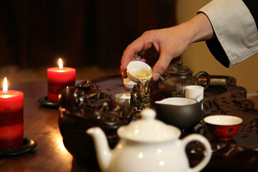 Наконец можно приступать к чаепитию. Чай разливают по специальным высоким чашкам — вэнсянбэй. Причём делают это так, чтобы у всех присутствующих была одинаковая крепость напитка. Для этого чашки наполняют не сразу, а на четверть, затем переходят к следующему гостю. И так делают по очереди, пока все чашки не заполнятся.