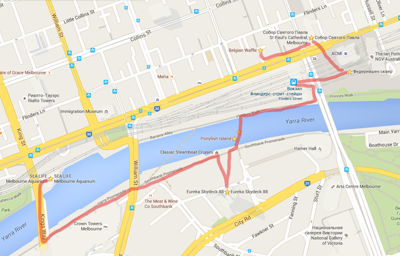 Сверим часы – на моих половина первого, пришло время двигаться дальше! За пешеходным мостом уже виднеется желто-оранжевый силуэт здания Flinders Street Station – одной из самой узнаваемой достопримечательности города. Переходите на другую сторону реки Ярра и идите по Flinders Walk до моста St.Kilda Road. Сфотографировавшись под часами и погуляв по Federation Square, расположенную прямо через дорогу, зайдите в собор Святого Павла, чтобы передохнуть и полюбоваться его красотами. После посещения St Paul's Cathedral отправляйтесь на поиски киоска с вкуснейшими бельгийскими вафлями Belgian Waffle, расположенном на углу Degraves St.