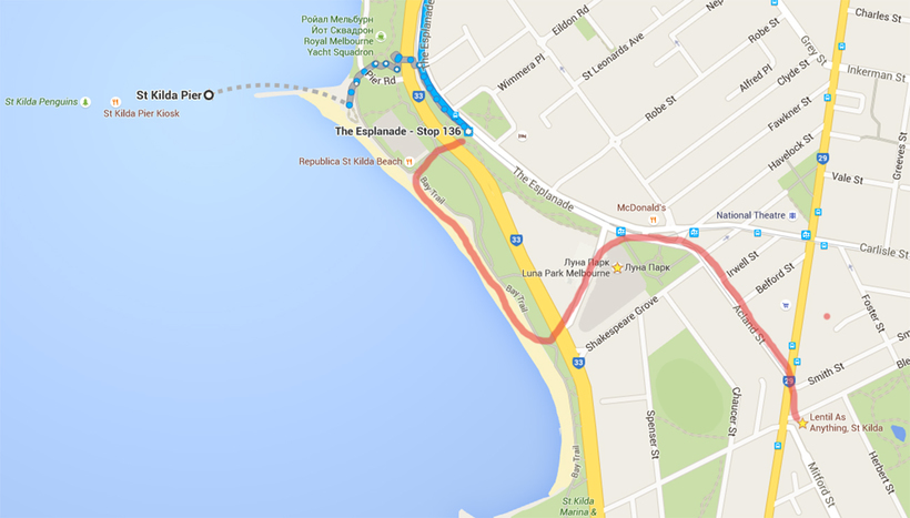 Следуя маршруту, не забудьте прогуляться до большой клоунской головы Луна-Парка, после чего выходите на Acland Street, прямиком в необычное кафе 'Lentil as Anithing', где в меню не указаны цены на блюда, а на выходе стоит ящик для пожертвований. Это культовое место, где оценить свой ужин вы можете самостоятельно.