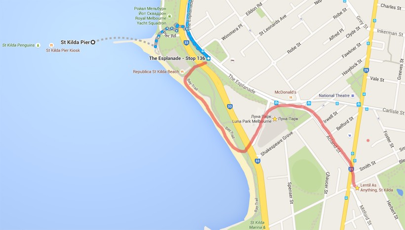 Обратите внимание на точку рядом с пирсом St.Kilda – St Kilda Pinguins, именно сюда каждый вечер приплывают на ночевку стайки пингвинов.