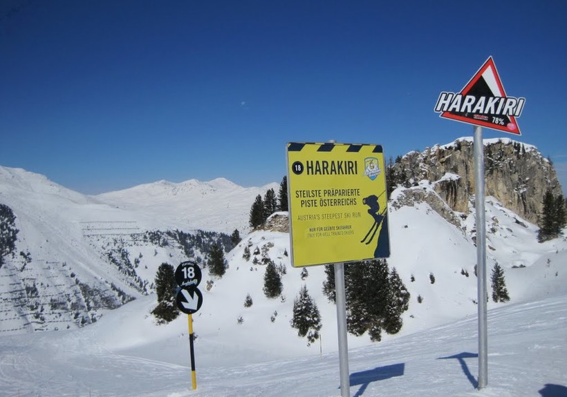 Майрхофен – достаточно популярный среди русских туристов горнолыжный курорт, расположенный в Северном Тироле, в долине Циллерталь. Он может похвастаться большим разнообразием трасс для спортсменов всех уровней, однако у него есть кое-что особенное, что ежегодно привлекает сотни, если не тысячи продвинутых горнолыжников. Именно здесь находится самая крутая и опасная в Австрии трасса с уклоном в 78% — то есть около 38-40 °. Она называется «харакири». Местные уже сделали из этого спуска некий тренд, и в сувенирных магазинчиках вы можете увидеть футболки с надписью «I survived Harakiri». К сожалению, многие несколько переоценивают свои способности, и поэтому перед трассой стоит множество табличек с надписями на разных языках, предупреждающие о сложном участке, а рядом всегда дежурят медики и спасатели.