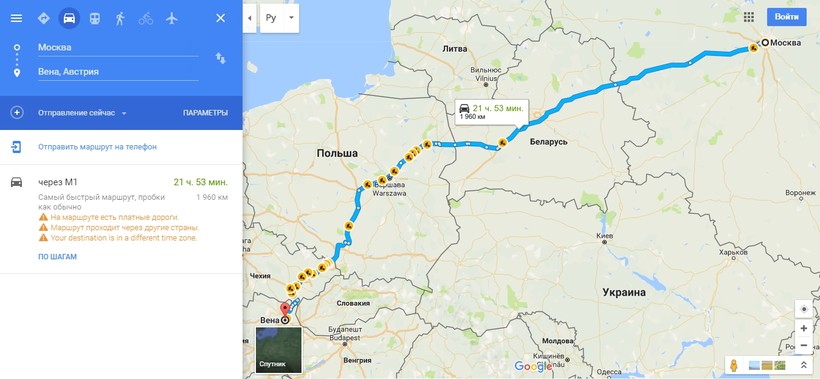 Путь из Москвы в Вену проходит через Белоруссию, Польшу и Чехию. Google map предлагает преодолеть 1960 км за 22 часа. Естественно, такая гонка вряд ли имеет смысл для человека, путешествующего с туристическими целями. По пути вам встретиться много интересных городов: Минск, Варшава, Брно. Можно также сделать небольшой крюк и завернуть в Краков.