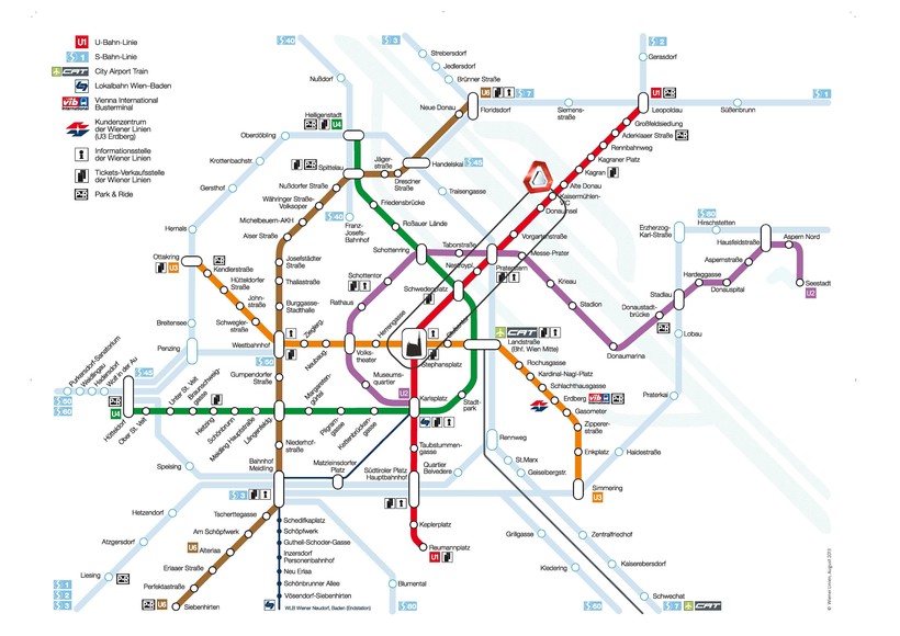 В Вене пять линий метро: U1, U2, U3, U4, U6. Линия U5 существует на данный момент лишь в отдаленных планах. Метро охватывает большинство значимых для туриста мест и работает с 5 утра до 12 ночи. Мне показалось очень удобным, что в ночь с пятницы на субботу, с субботы на воскресенье и накануне праздников, метро открыто 24 часа в сутки.