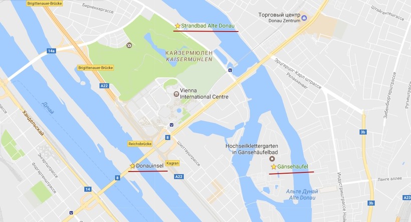 Можно отправиться на Дунайский остров, возникший в результате реконструкции дунайского бассейна в черте города. Copa Cagrana, как его называют венцы, это прекрасное место для отдыха с песчаными пляжами, зонами для пикников, спортивными площадками, пешеходными тропами, кафе и барами. Сюда можно доехать на метро, линия U 1 станция Donauinsel.