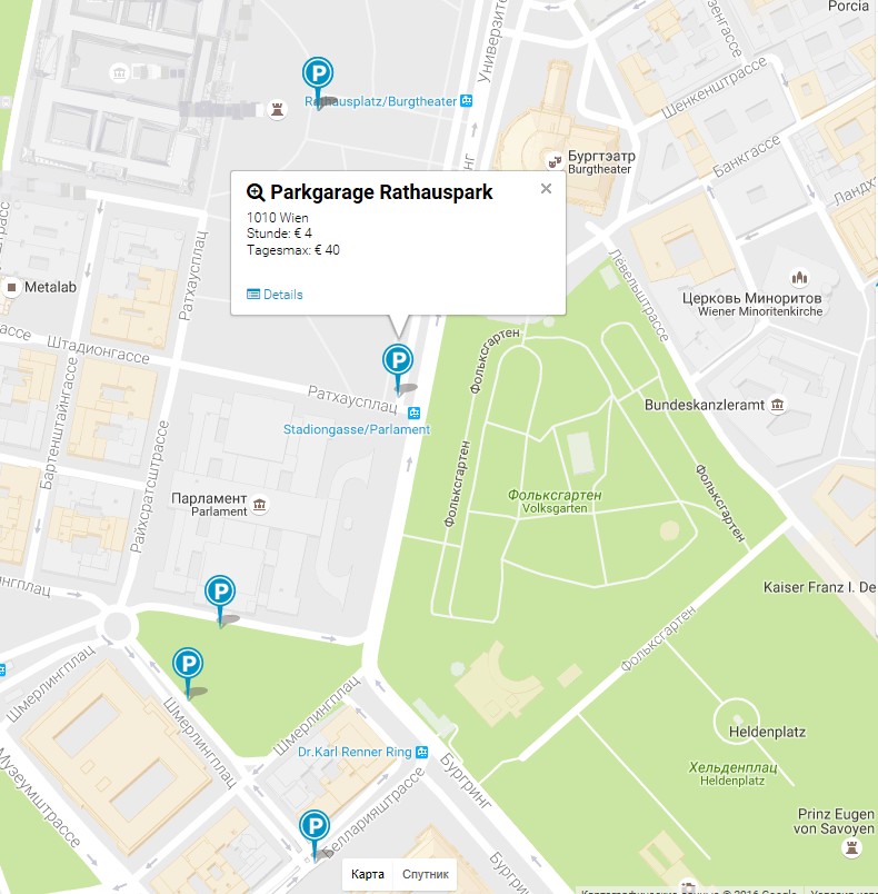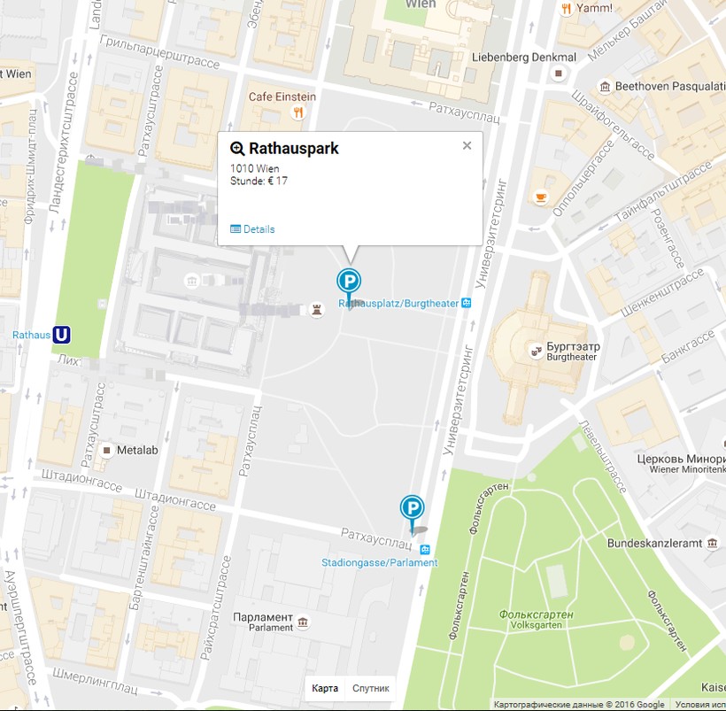 Подземный паркинг Parkgarage Rathauspark ниже на карте.