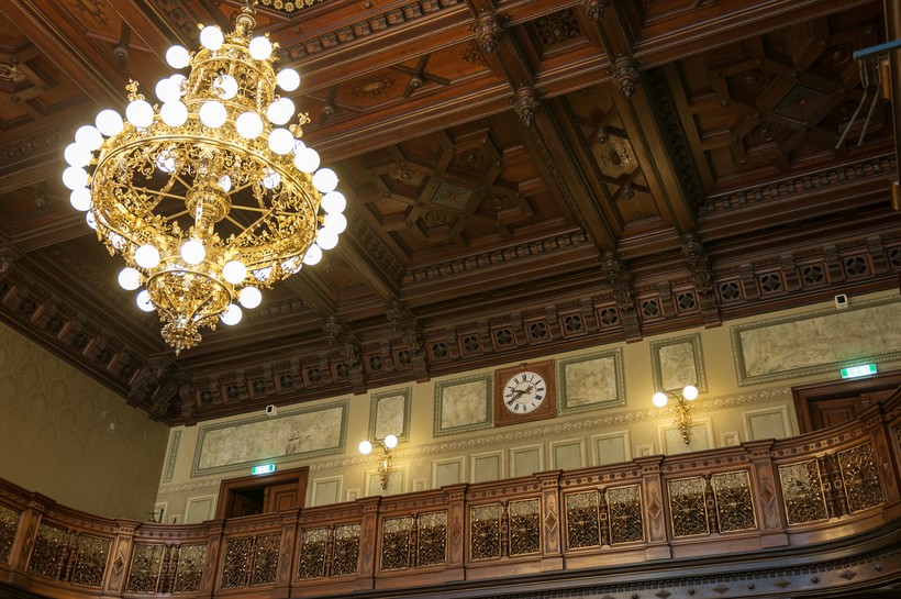 В зале проходят заседания парламента и муниципального совета. Здесь особое внимание привлекают деревянные драгоценные потолки с богато украшенным декором. Значительные события в истории Вены оживают во фресках художника Людвига Майера. На них изображены сцены с 13-го до 19-го вв.