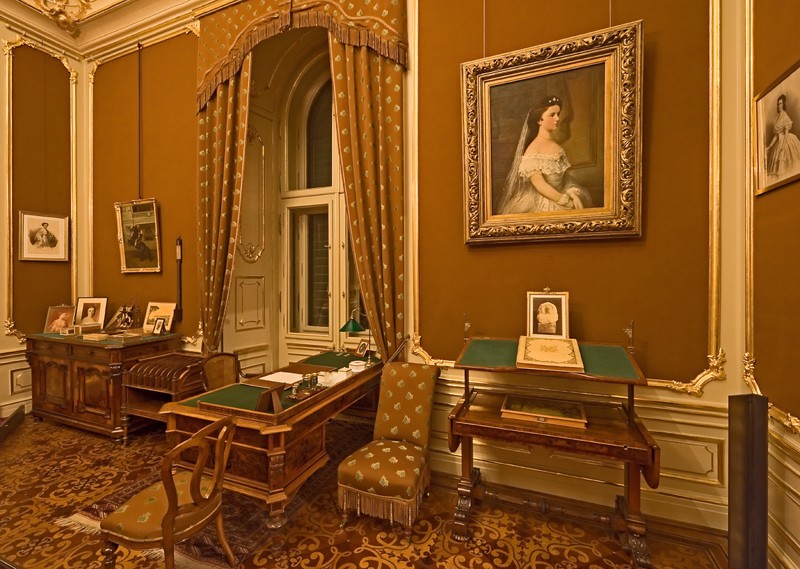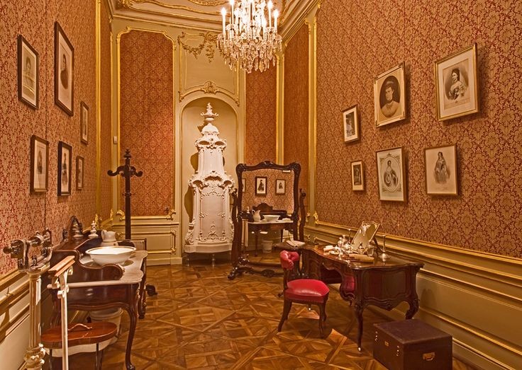 Император вставал в 4 утра, умывался холодной водой и молился. А еще здесь можно увидеть портрет принца Рудольфа и портрет самого императора перед смертью. На выходе из комнаты в конце 19 века был установлен туалет в английском стиле.