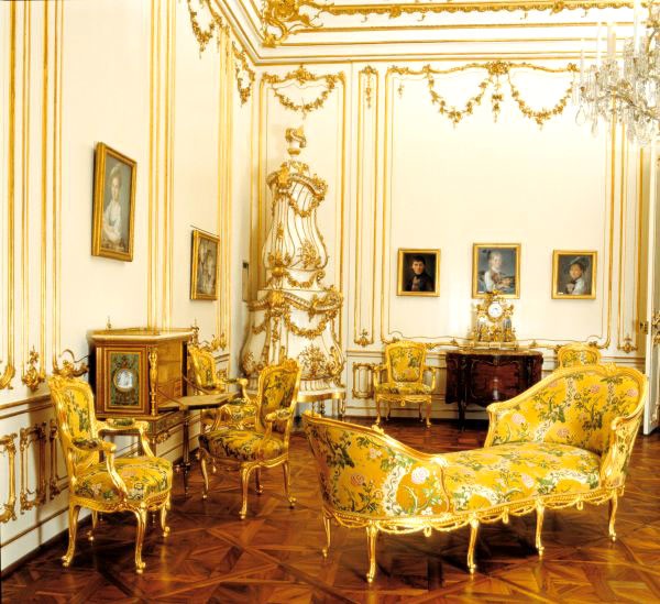 Кресла обиты золотой шелковой тканью, стены также отделаны золотыми украшениями. Стиль —рококо.