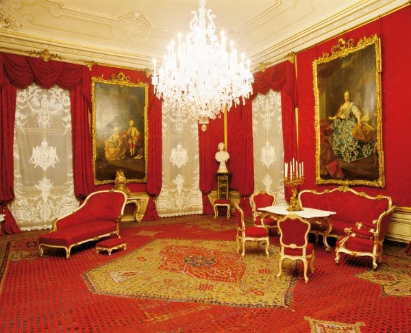 А здесь, в правой половине, вы можете увидеть портрет Марии Терезии. Она была дочерью императора Карла VI и родилась в 1717 году. В возрасте 19 лет она вышла замуж за Френсиса Стефана Лотарингского и родила ему 16 детей: 11 дочерей и 5 сыновей. Комната украшена несколькими портретами ее девочек.