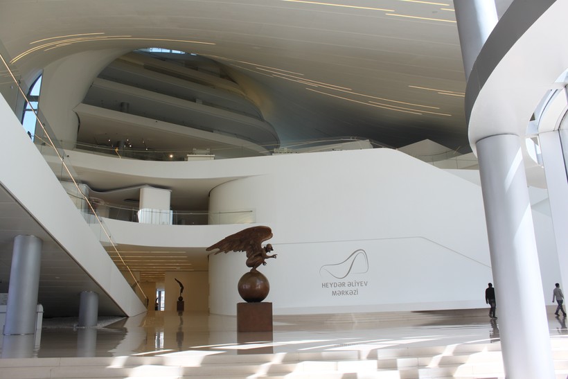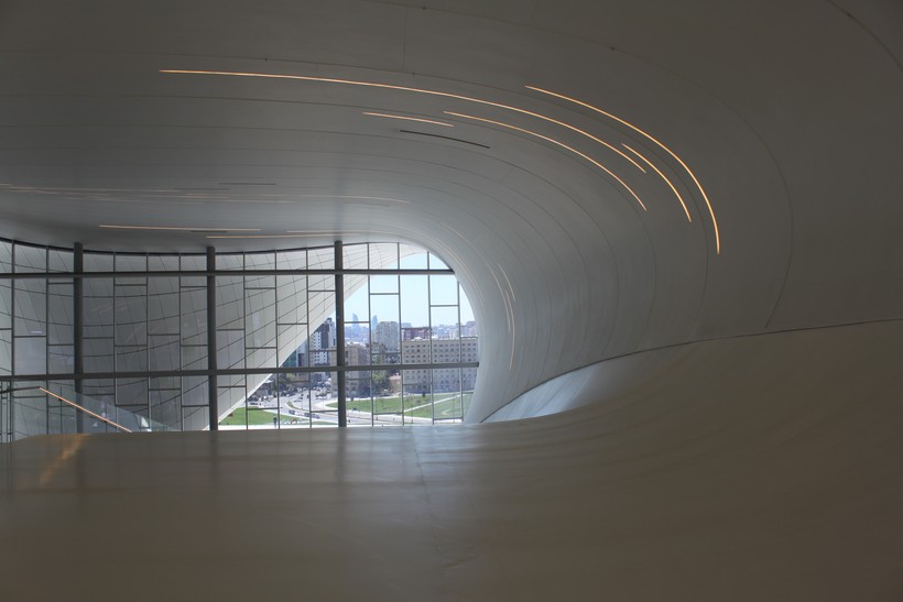 Кроме того, в центре Гейдара Алиева интерес вызывает остекление, которое впускает во внутреннее пространство свет и делает все еще более объемным и выпуклым. Знаменательно то, что в постройке вообще нет несущих колон, так как Заха Хадид не хотела мешать потокам посетителей. При этом здание очень прочное и легко выдерживает сильные бакинские ветра.