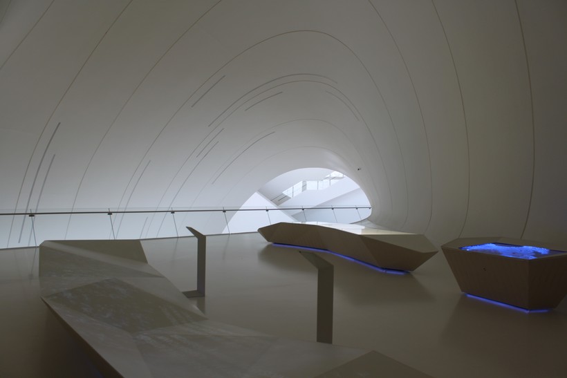Интерьеры производят еще большее впечатление, чем внешний вид сооружения. Честно говоря, когда мы зашли туда, мы просто замерли от восторга! Кажется, что ты попал в совершенно новое, иное пространство и измерение, в котором все немного по-другому, не как в привычном мире. А белый цвет, обилие воздуха и повторение основного мотива даже в таких деталях, как светильники в кафе, делает центр Гейдара Алиева по-настоящему ошеломляющим местом!