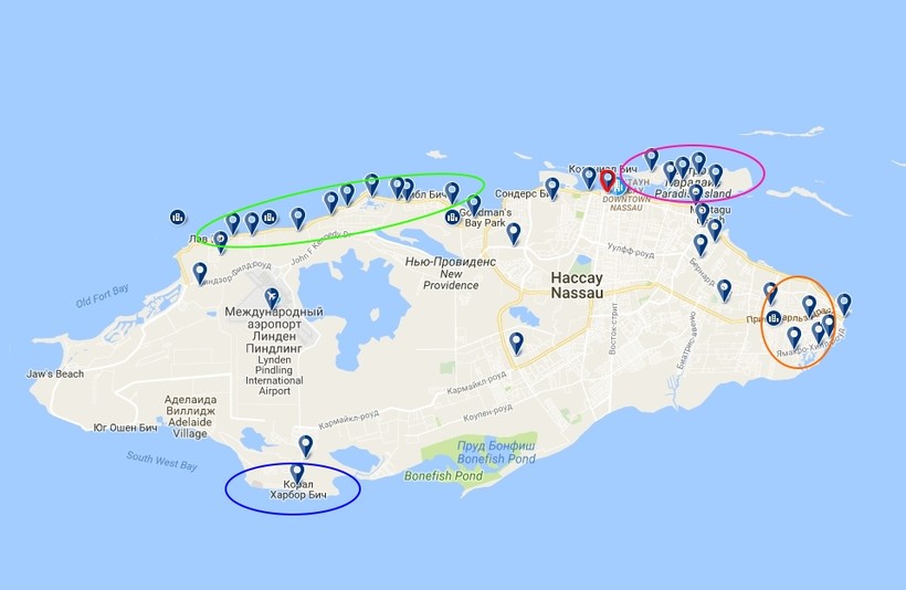 Насчет того, где лучше жить в Нассау, я не могу дать однозначного ответа. Варианты размещения различаются по расположению, цене и особенностям отдыха. На карте ниже я постаралась обозначить основные области, в которых располагаются отели.