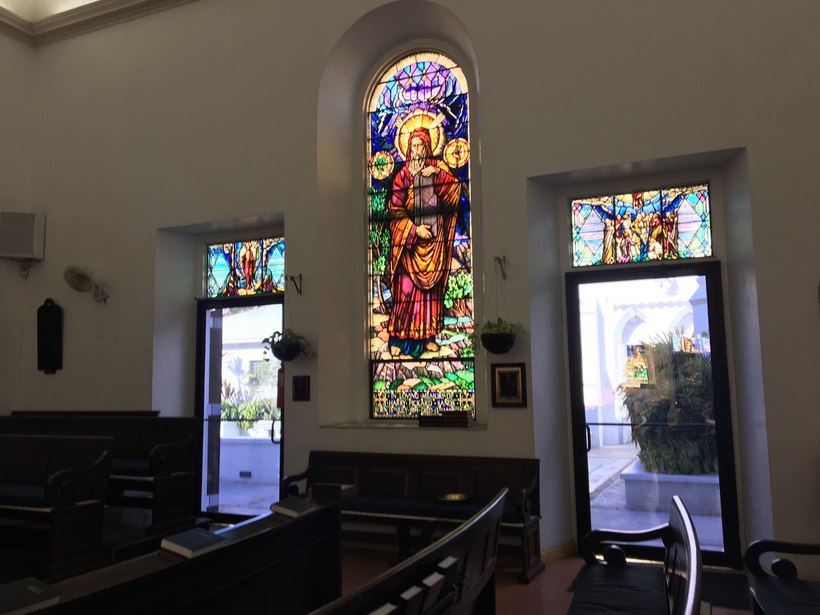 Несмотря на то, что когда я там была, храм был совершенно пуст, это место мне очень понравилось и показалось гостеприимным. Я зашла туда ненадолго, из простого любопытства, и удивилась: над алтарем висело два полотна для проектора, на которых высвечивалась жизнеутверждающая цитата Томаса Уотсона о Боге, играла спокойная поп-музыка. А рядом — очень красивые витражи. Все-таки меня очень удивляют и одновременно восхищают церкви, приветливо настроенные по отношению к современности. Не могу все то же самое представить в простом православном храме в Москве.