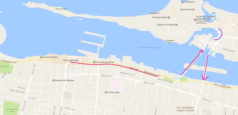 Все круизные лайнеры прибывают на причал Принца Джорджа (Prince George Wharf). Он находится на другой стороне острова по отношению к аэропорту — в центре Нассау. От причала можно дойти пешком практически куда угодно в этом районе, но если вам нужно преодолеть довольно большое расстояние, то стоит сесть в автобус (остановка у выхода из порта) за 4 USD или поймать такси — о тарифах я расскажу ниже.