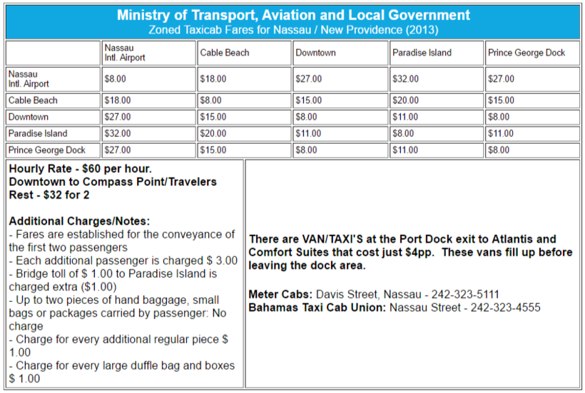 В среднем, поездка на такси в центр города или на Paradise Island обойдется в 25–30 USD и займет примерно полчаса. Я где-то видела информацию о том, что из аэропорта в центр ходят недорогие автобусы, проезд на которых обойдется всего лишь в 5-7 USD, но, во-первых, довольно трудно найти остановку, во-вторых, автобусы в Нассау ездят очень неприятно — сильно превышают скорость и совершают довольно резкие маневры. Если вы все же готовы рискнуть, то об автобусной остановке стоит спросить в аэропорту. Если нет — целая очередь из такси растягивается прямо у выхода.