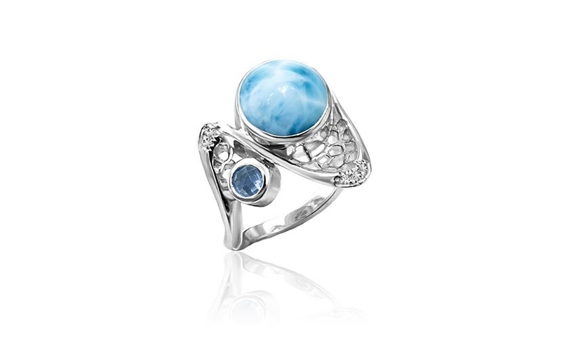 Если вы любите необычные серебряные кольца с яркими вставками, обратите внимание на украшения MarahLago с прекрасными голубыми ларимарами. Этот камень всегда будет напоминать вам о море.