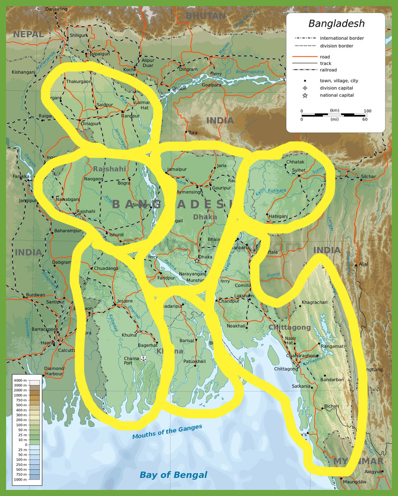 Вообще Бангладеш имеет выход к морю: вся северная граница страны омывается Бенгальским заливом. Но граница эта настолько «порвана», что подъехать к ней паром если и сможет, то уж точно не сможет высадить людей на сушу. На карте граница выглядит как бахрома: множество мелких каналов втекают в пространство материка, так что проехать здесь можно только на узкой лодке.