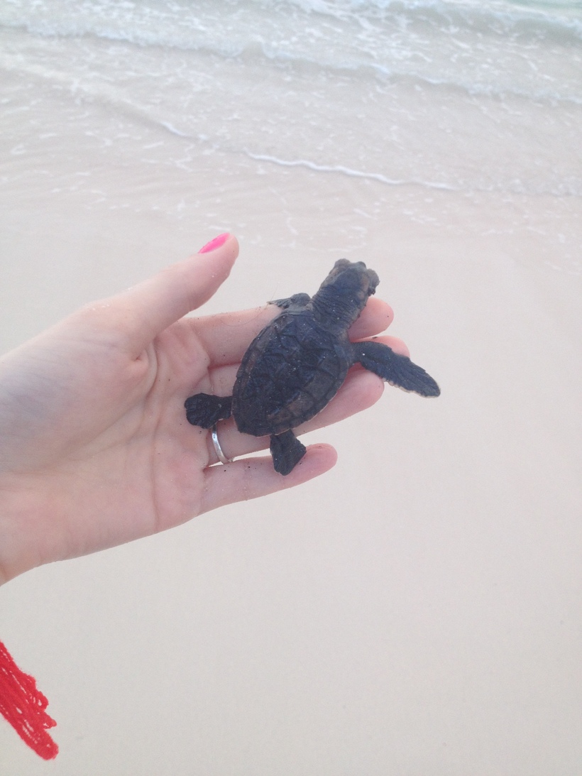 - Езжайте на рынок в Остинс и попросите у рыбаков потроха. За рынком есть выход на причал. Идите на него и постепенно кидайте в воду в одном месте куски рыбы. Через минут 15 приплывут огромные черепахи, а может даже и скаты. Кстати, вы попадете на сезон вылупления черепашат, если поедете на Барбадос в ноябре. Если увидите заплутавшую черепашку, отнесите к морю. Я таких малышей пять штук на парковке нашла. Вот фото одного: