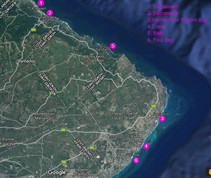 - Bathsheba & Cattlewash (Батшеба Бич и Катлвош) — самый причудливый пляж острова. Ведь здесь прямо из воды, как инопланетные космические корабли, торчат огромные валуны. Вода камень точит — за тысячи лет волны выбили из скал диковинные фигуры. Редко какой смельчак решает здесь искупаться. Зато для серферов — раздолье. Остановиться можно в Round House или Rest Haven Beach Cottages, забронировать эти отели можно на Booking, а сравнить, нет ли где цены ниже, вот здесь. Недорогие гестхаузы можно поискать тут. Это одно из самых душевных мест Барбадоса. Бэйджаны приезжают сюда целыми семействами на пикники, здесь гуляют влюбленные парочки, тренируются спортсмены. Здесь есть ресторанчик Sea Side Bar, в котором любят тусоваться местные пенсионеры. Они приходят целыми бандами в своих лучших костюмах и платьях, обедают, пьют коктейли и травят байки. Наблюдать за счастливыми стариками так приятно. Особенно, когда ждешь своего лобстера.