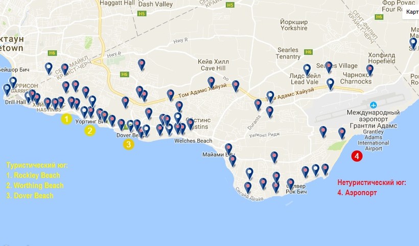 - В пяти минутах от Сент-Лоренс Гэп расположился район Worthing (Уорфинг). Я советую селиться на пляжах Worthing (Уорфинг Бич) и Rockley Beach (Rockley Бич). Отдыхаете с детьми? Отлично, здесь тихо, уединенно, но при этом все в шаговой доступности. Отдыхаете парой? Селитесь здесь. До улицы вечеринок 5 минут пешком, до Бриджтауна 10 минут на автобусе, а до Остинса 5 минут на автобусе. Местные сюда приезжают, но не в таком количестве, как на Miami Beach (Майами Бич). Это еще один пляж на юге. Пользуется популярностью у бэйджанов. Поэтому на нем не так приватно, как на Довере и Уорфинг Бич.