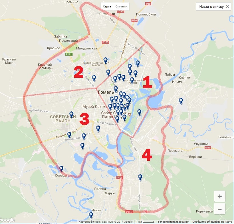 Гомель — город довольно небольшой, в нем всего четыре района (на карте я отметила их соответствующими номерами):