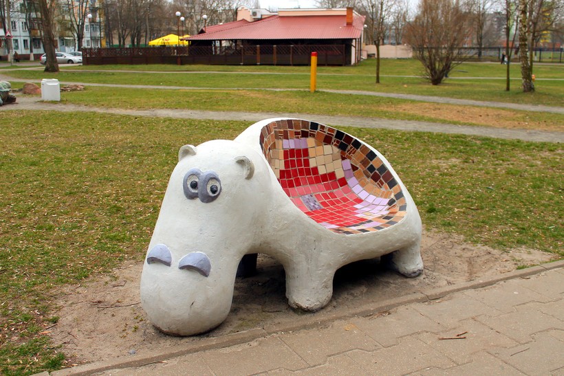- Аллея скамеек. Находится в парке «Фестивальный» (о нем я расскажу ниже) и демонстрирует собой невообразимый полет фантазии. Скамейка в виде женской косметички? Пожалуйста! Скамейка в форме жирафа? Вообще не вопрос!