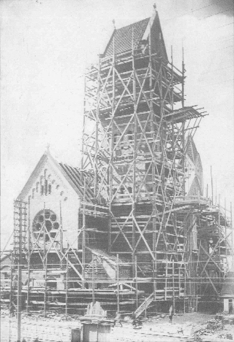 Как я уже упомянула, Красный костел является типичным представителем неороманского стиля. И возведен он, понятное дело, из красного кирпича, за что и получил своё неофицальное название. С восточной стороны находится башня высотой 50 метров, которая и является центром всей архитектурной композиции. Во дворе церкви можно увидеть внушительных размеров бронзовую скульптуру –архангел Михаил борется с крылатым змеем, а также памятник «Колокол Нагасаки» в честь жертв ядерных катастроф.