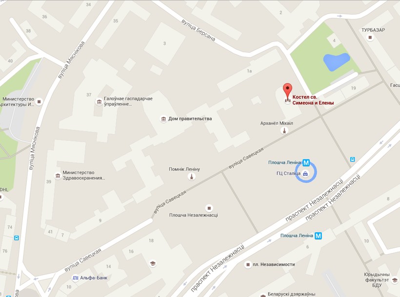 Красный костёл расположен в центре города, на площади Независимости, поэтому от многих значимых мест рукой подать. В шаговой доступности, например, Дом Правительства Беларуси и подземный ТЦ "Столица" – тут можно довольно бюджетно перекусить или купить что-то из необходимого.
