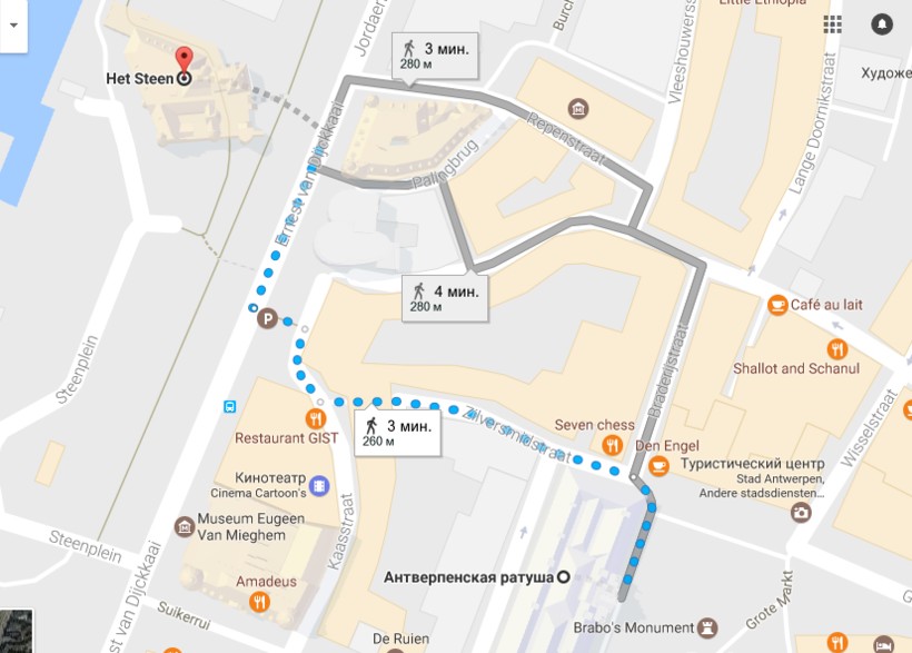 Рядом с замком Het Steen находится остановка Antwerpen Suikerrui Steenplein. Как добраться на общественном транспорте сюда из разных частей города вы сможете узнать на этом сайте. Рядом с этой остановкой находится парковка городских велосипедов Velo.