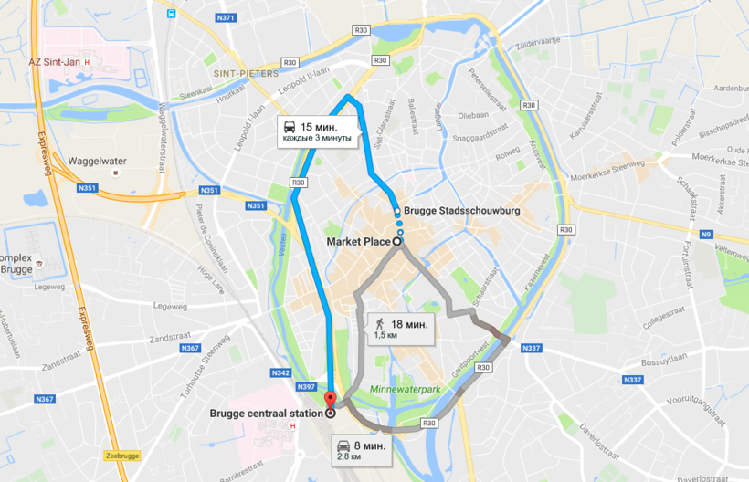 Вокзал Брюгге (Brugge Centraal station) расположился по адресу Stationsplein 4, от него несложно добраться в самое сердце старого города. До одной из центральных площадей можно дойти пешком за 17-20 минут или доехать на автобусе – от вокзала сюда идут маршруты 2, 7, 9, 12, 15 и 25, поездка займет примерно 15 минут; остановка в центре – Brugge Stadsschouwburg, далее по пешеходной зоне вы можете отправиться в любую точку города.