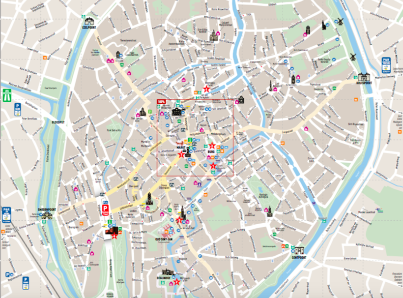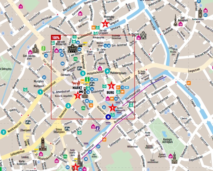 Этот исторический район окружен кольцом реки Vesten. Ниже я разместила карту старого города: именно в этой части Брюгге сосредоточились основные достопримечательности города и пешеходная зона, включающая две ключевые площади – Маркт и Бург (пешеходная зона обведена красным квадратом на карте). Жилье лучше всего выбирать в этом районе.