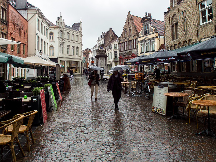 Нам в наш приезд в Брюгге с погодой очень не повезло: мы были в конце июля, в первый день на улице было всего 13 °C и до 5 вечера дождь лил стеной, так что гулять было почти невозможно – мы отсиживались в кафе, внимательно изучали ассортимент магазинов с шоколадом и кружевом и старались не выходить на улицу надолго. К 6 вечера показалось солнце, но уже в 8 на улице стемнело, так что осматривать всё мы отправились лишь следующим утром (которое, кстати, было не теплее предыдущего дня).