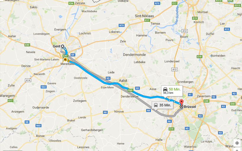 Чтобы добраться из Гента в Брюссель, воспользуйтесь автомобилем или поездом. На машине выезжайте на ту же трассу E40. В Брюсселе будете примерно через 50 минут. На поезде доберетесь за 36 минут. Вам нужен прямой скорый поезд IC до Брюсселя. Один взрослый билет стоит 9,20 EUR.