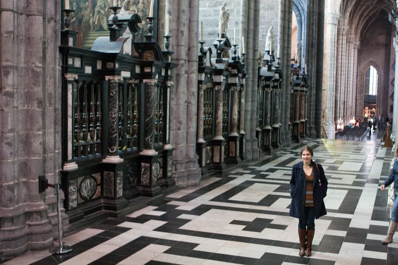 Массивное здание XIII-XV вв. Смесь романского стиля с элементами брабантской готики. Размеры и внутренний интерьер действительно впечатляют! Красивейшие витражи и пышность убранства наверняка заставят вас на некоторое время замереть в изумлении, как это случилось со мной.