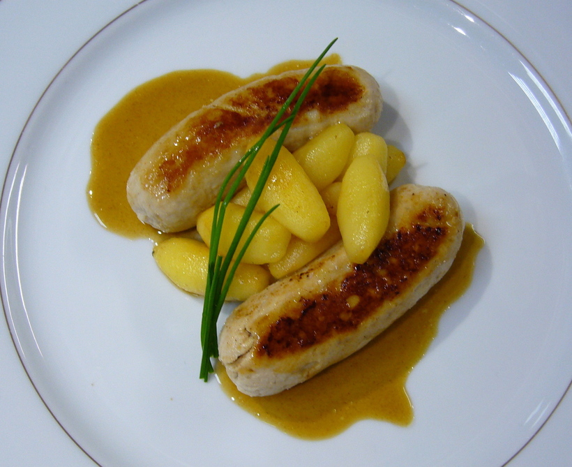 Буден блан – это белые сосиски с молоком. Их утонченный вкус и изящная структура не похожи ни на одну другую сосиску. Обычно их жарят на гриле или в масле, подают с картофельным пюре или яблочным компотом.