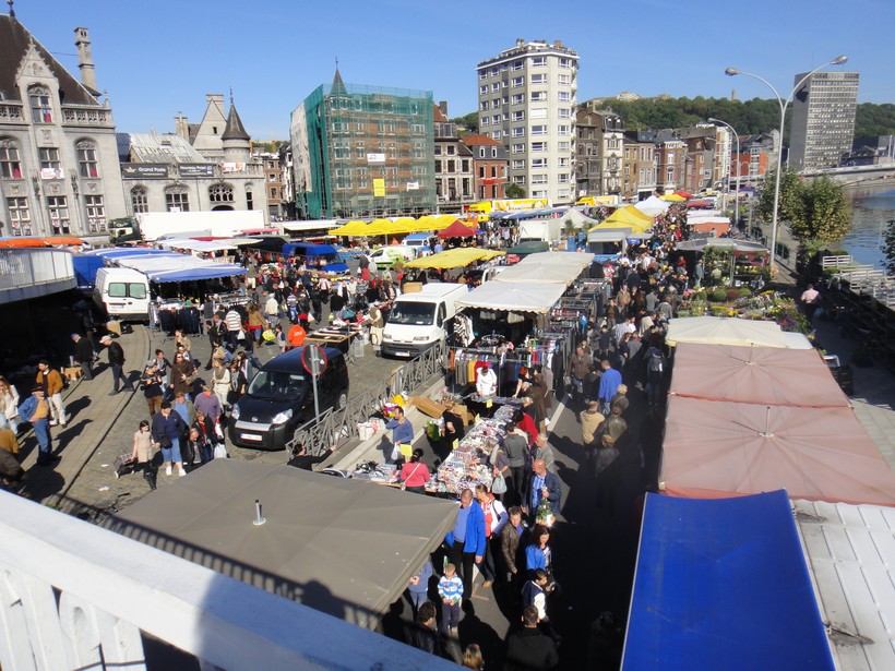 - В конце улицы Орс-Шато (Hors-Château) на юге города расположена Плас дю Марше (площадь Марше) - площадь, заставленная кафе, домами, построенными в 15 веке и изящным зданием местной администрации. Для посещений открыта комната потерянных шагов (salle des pas perdus), а вот остальная часть здания, разрушенная французами в 1691 и вновь построенная в 1714, обычно закрыта. Монументальный фонтан Перрон (Perron), расположенный в центре площади, является символом свободы города.