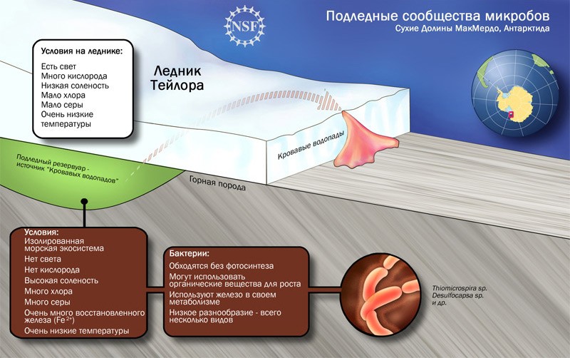 В необычном озере и кроется разгадка кровавого водопада Тейлора. Все дело в том, что, несмотря на подледное расположение и высокую соленость (в 4 раза выше, чем вода в океане), озеро не лишено жизни. Обитающие в нем микроорганизмы, а это целых 17 видов, прекрасно приспособились к жизни в темноте. Источником энергии в такой экосистеме выступает не солнечный свет, как в наземных сообществах, а энергия химических связей. Донные породы богаты соединениями железа. В ходе жизнедеятельности хемосинтезирующие бактерии преобразуют эти вещества, а в воду выделяются соединения железа, окрашивающие ее в красный цвет.