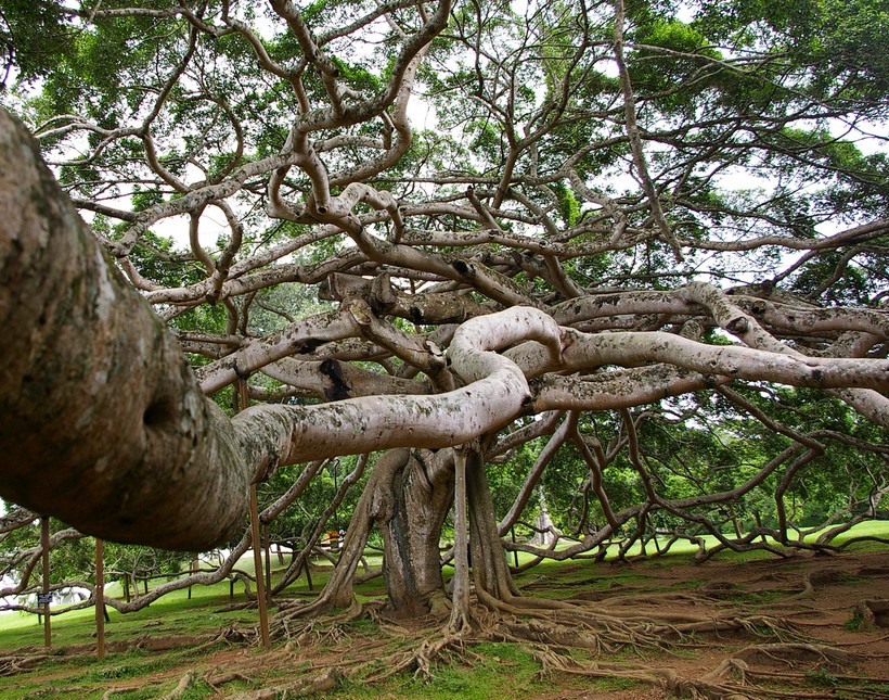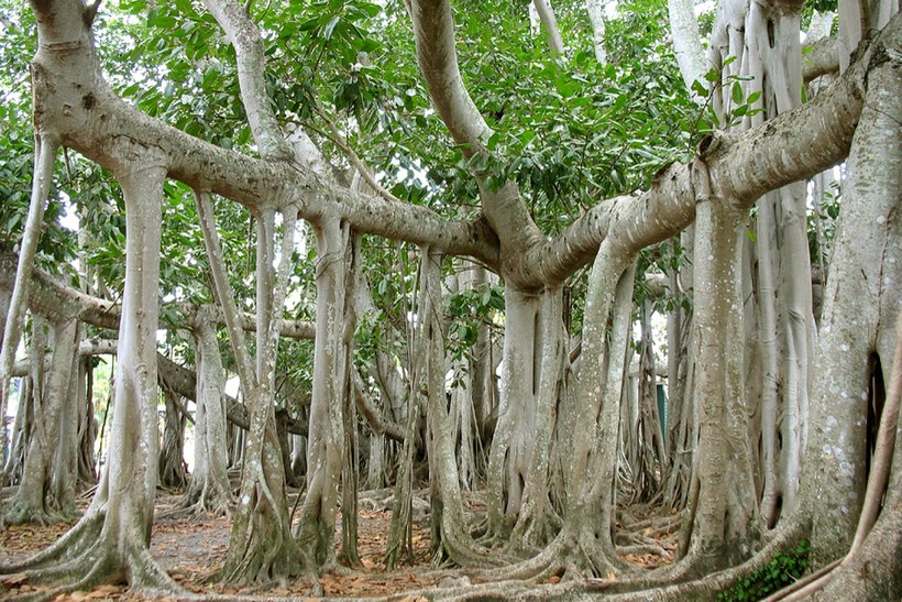 Образование воздушных корней — явление весьма распространенное среди растений в тропических широтах. Ну а в случае с Великим баньяном они выполняют еще и опорную функцию: удерживать такую обширную крону на одном стволе было бы невозможно. На сегодняшний день у самого большого фикуса на свете имеется более 3000 воздушных корней, которые уже вросли в землю. Со временем корни становятся толще, увеличиваются в размерах и уже сами становятся похожи на стволы деревьев. Кажется, что перед вами сказочный лес, деревья которого срослись кронами.