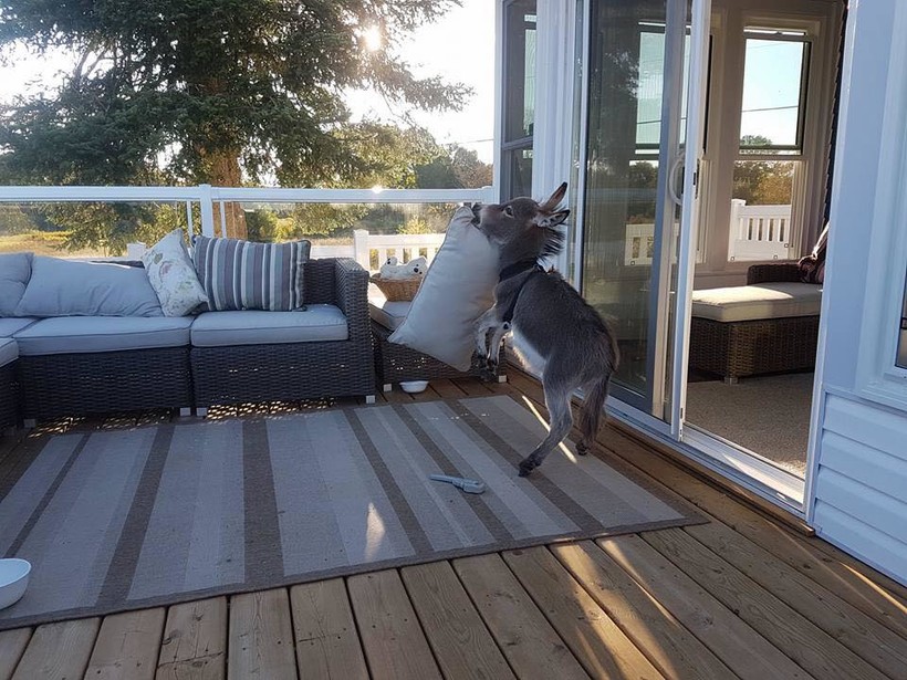 В теплое время года ослик очень любит резвиться на ферме, но все-таки дом — это его любимое место. Особенно Тим любит диванные подушки: он часто таскает их за собой и даже строит некое подобие загона.