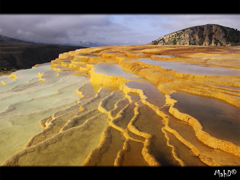 На севере Ирана в провинции Мазендеран, на высоте 1840 метров над уровнем моря есть поразительные травертиновые террасы. Они образовались за несколько тысячелетий из двух минеральных источников, стекавших по горам. Подобные террасы можно увидеть и в других уголках света (Мамонтовые горячие источники в Йеллоустоуне, Памуккале в Турции), но травертины Ирана уникальны и похожи на место с другой планеты: они желтого, красного и оранжевого цвета. Цвет им придает высокая концентрация оксида железа.