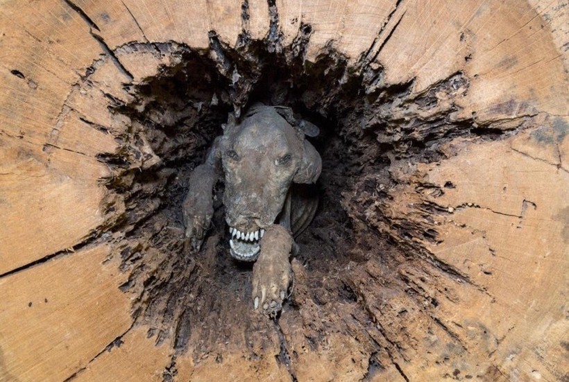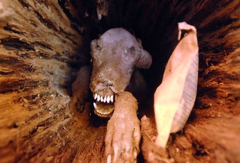 Около шестидесяти лет назад этот пес преследовал енота или белку, забрался в дупло… и не смог оттуда выбраться. Примерно через двадцать лет его мумию обнаружили лесорубы, представьте, каково было их удивление!