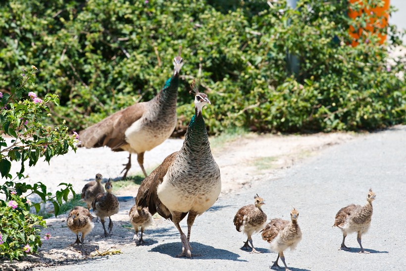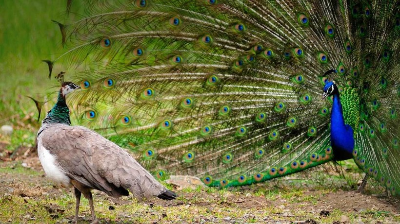 Самки павлинов, по сравнению о своими кавалерами, довольно скромны . Их наряд скорее маскировочный, чем помпезный, хотя они и имеют хохолок на голове и некоторый цветной отлив перьев.