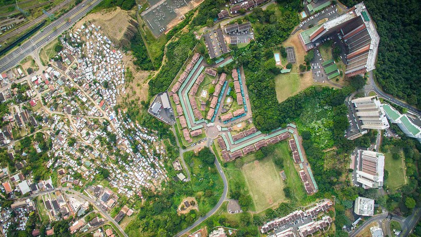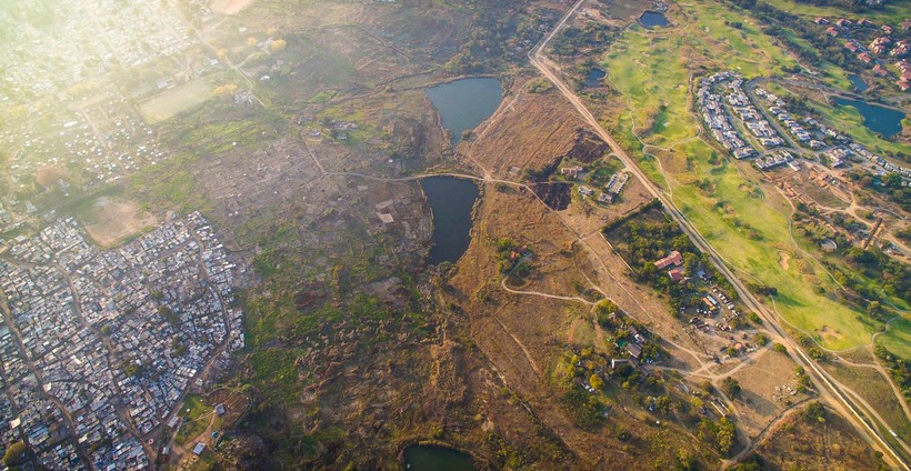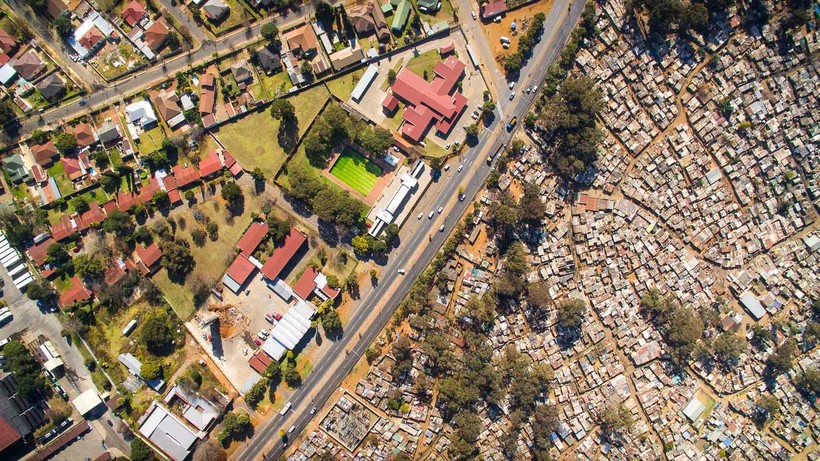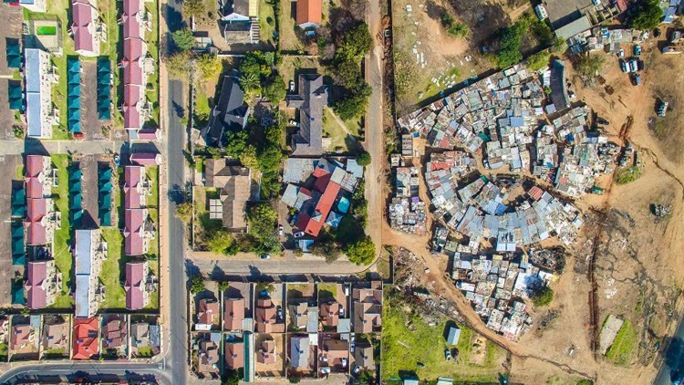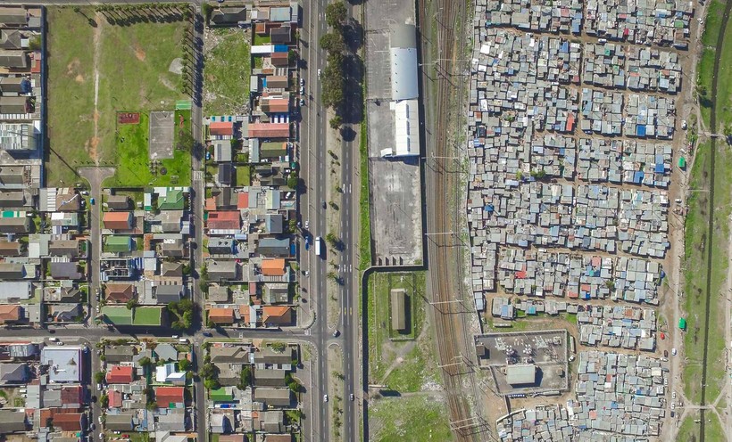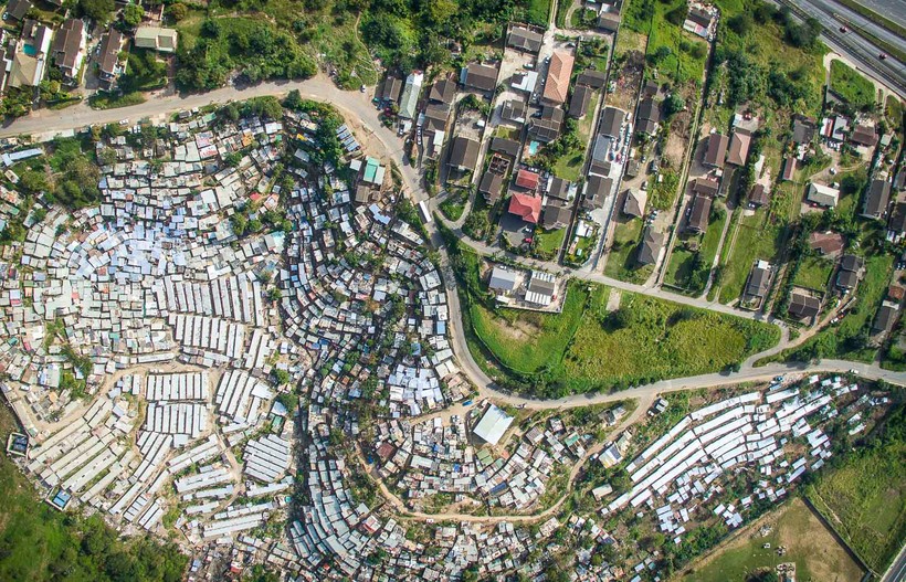 Минуло уже более 20 лет с того момента, как апартеид завершился, однако здесь все так же можно увидеть социальное неравенство. Миллер сделал эти фотографии с помощью беспилотника, и здесь самым наглядным образом зафиксирован разрыв между богатыми и бедными. Фотограф отмечает, что в ЮАР по-прежнему наблюдается расовая дискриминация и экономическая напряженность между черными и белыми жителями страны, хоть количество белых в последние годы сокращается. Чернокожие все еще сталкиваются с глубокой нищетой и безработицей. С одной стороны существуют болезни, преступления, горе и гнев, когда как буквально через дорогу, по соседству — богатая жизнь, полная радости, люди, у которых есть автомобили, большие дома, бассейны, интернет и полная уверенность в следующем дне. Но не обязательно ехать в ЮАР, чтобы увидеть эту пропасть.