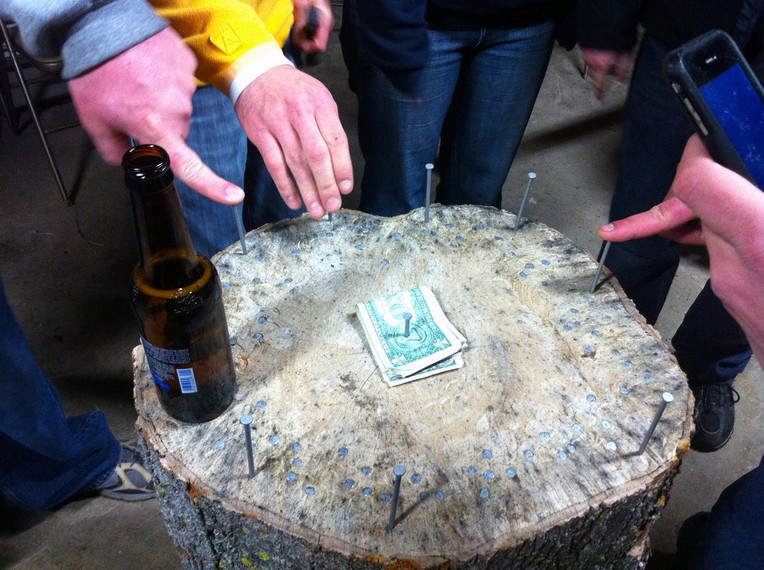 Для игры вам нужен молоток, пень, гвозди, пиво и стоять на ногах. Посередине ставят пень с торчащими из него гвоздями (на каждого игрока), которые нужно вогнать в дерево полностью. Однако это нужно сделать со всего размаха, а перед тем желательно подкинуть молоток в воздух на долю секунды. Всякий раз, когда вы не попадаете - вы выпиваете. .