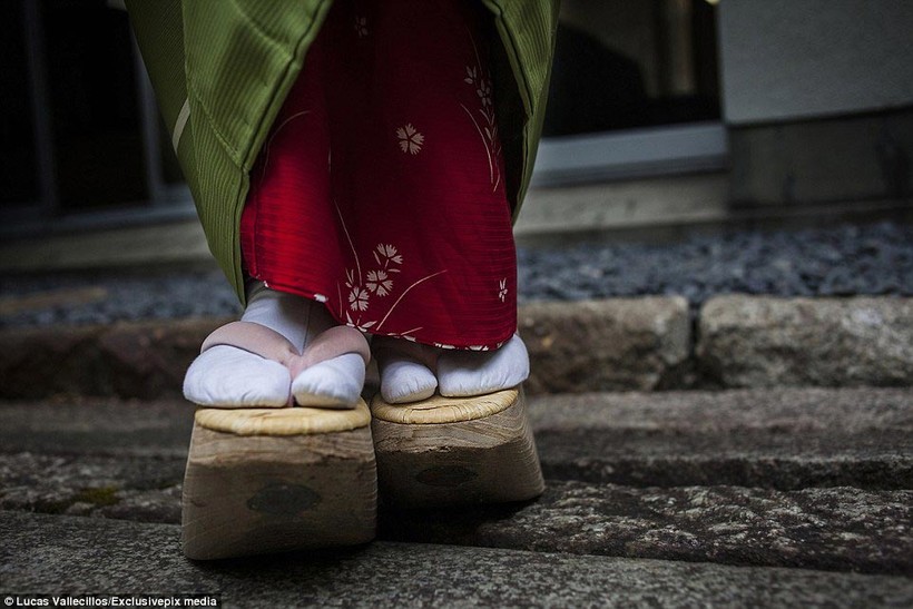 На ноги гейши надевают специальную обувь на высокой танкетке, выполненной из дерева. Эта обувь называется окобо.