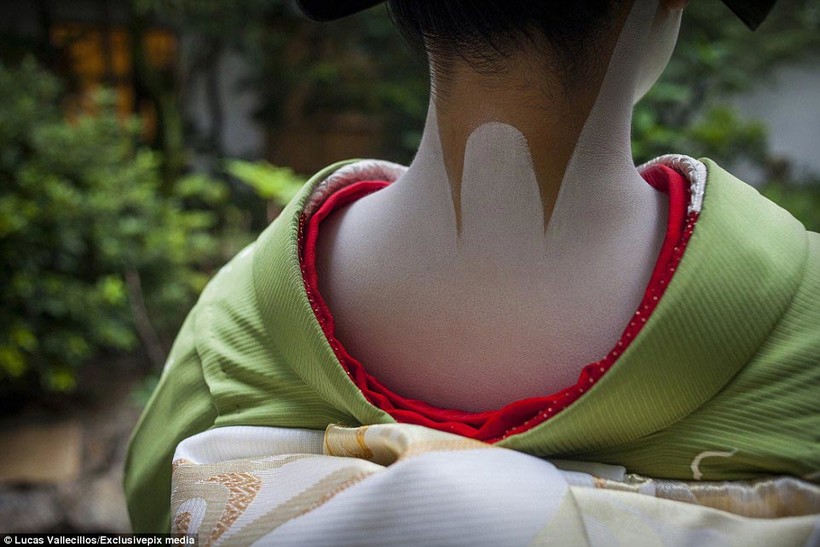 Белый грим гейши наносят также на спину, шею и плечевую область.