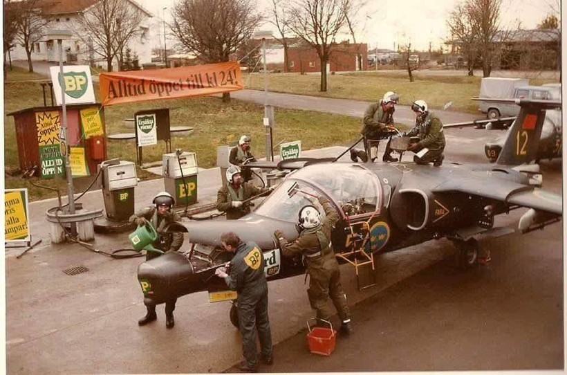 На рекламном фото автозаправок компании «Бритиш Петролеум» военнослужащие ВВС Швеции с военной базы F–16 Uppsala заправляют и обслуживают учебный реактивный самолет