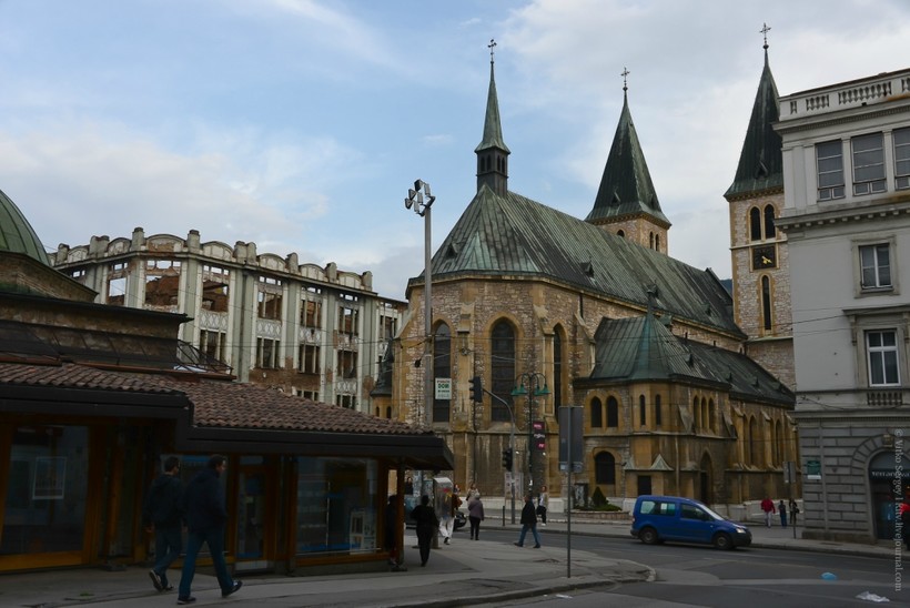 25. С приходом австрийцев в конце XIX в начале XX века заметно увеличилось и католическое хорватское население города. В 1889 году открыл свои двери великолепный готический собор «Святейшего Сердца Иисуса». Главный католический кафедральный собор страны. Конечно собор пострадал от войн XX века, но каждый раз его восстанавливали.