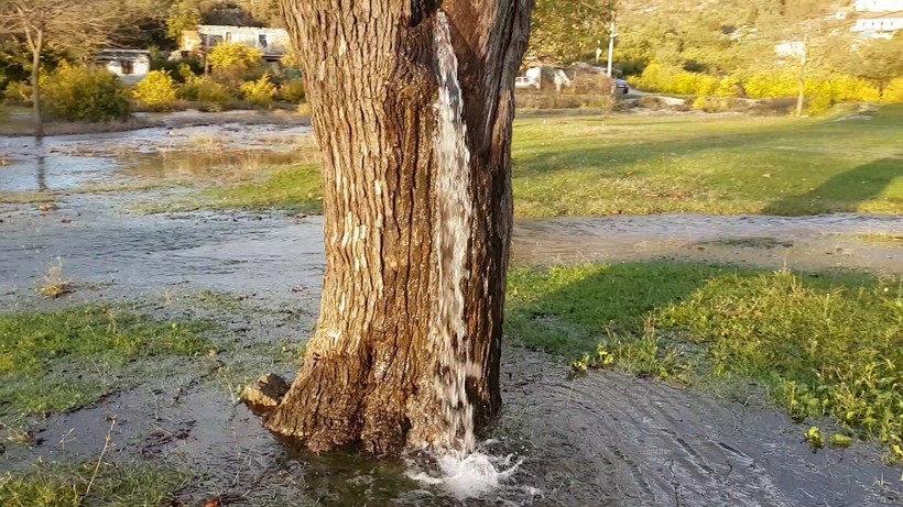 На самом деле водопад легко объяснить: на глубине нескольких метров под деревом есть подземные источники. Когда проходят сильные дожди, вода под собственным давлением пытается выбраться наружу. Такие временные «ключи» после ливня появляются на всей территории возле дерева: вода выходит и из других отверстий на лугу.